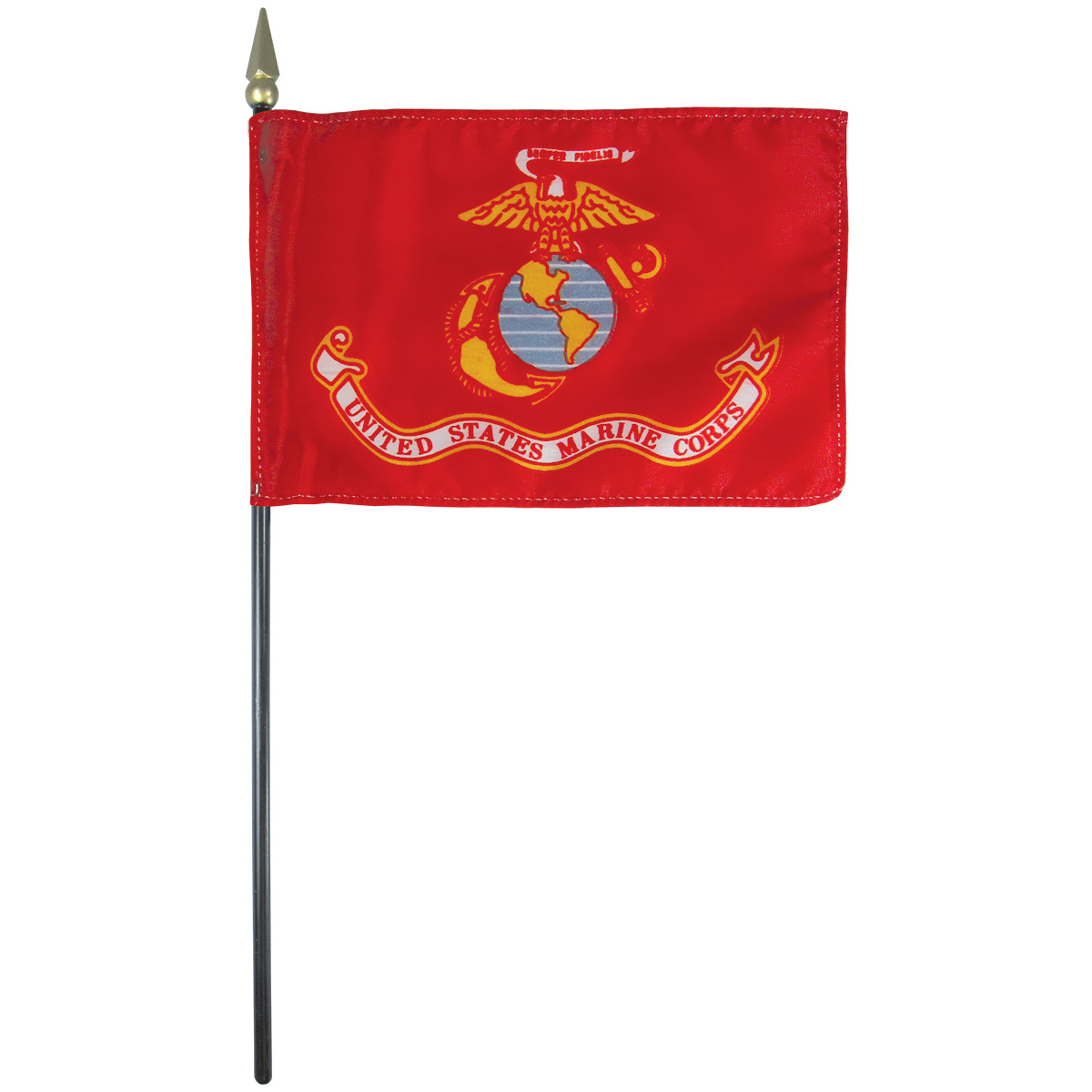 Flags International is proud to offer this Marine Corps Mounted Flag. The official flag is scarlet with the Corps emblem in gray and gold. It was adopted on January 18, 1939, although Marine Corps Order 4 had established scarlet and gold and the official colors of the Corps as early as 1925. The indoor/parade version is bordered by a gold fringe while the outdoor version is plain. It measures 55 inches (140 cm) on the hoist and 62 inches (160 cm) on the fly. In addition to the multi-colored battle streamers (measuring 3 feet (0.91 m) by 23_4 inches (7.0 cm) wide) affixed to the top of the staff, the staff itself is covered with sterling silver bands engraved with the names of conflicts in which the Corps has been engaged.